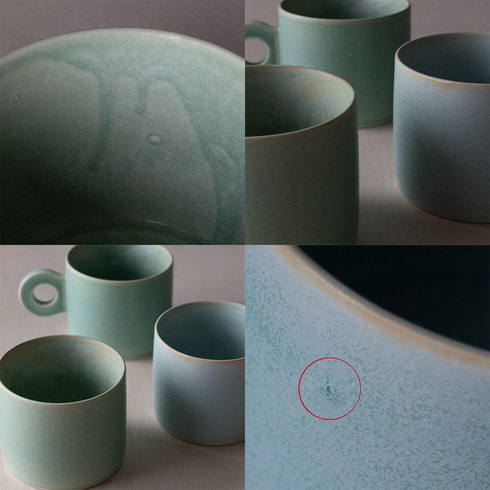· 제품은 민트 색상을 바탕으로 제작되었으나, 도자기 특성상 가마 소성 과정에서 다양한 변수에 의해 색감이 달라질 수 있습니다. 소성 시 기물의 위치, 가마 내부의 온도 분포, 습도 및 유약의 두께와 같은 조건에 따라 색상이 미묘하게 달라질 수 있으며, 어떤 경우에는 블루 톤이 조금 더 도드라지거나 그린 톤이 더욱 강하게 표현되기도 합니다. 이와 같은 차이는 도자기 유약이 지닌 자연스러운 특성이며, 각각의 기물이 가지는 고유한 아름다움으로 이해해 주시면 감사하겠습니다. (아래 사진을 참고해 주세요)