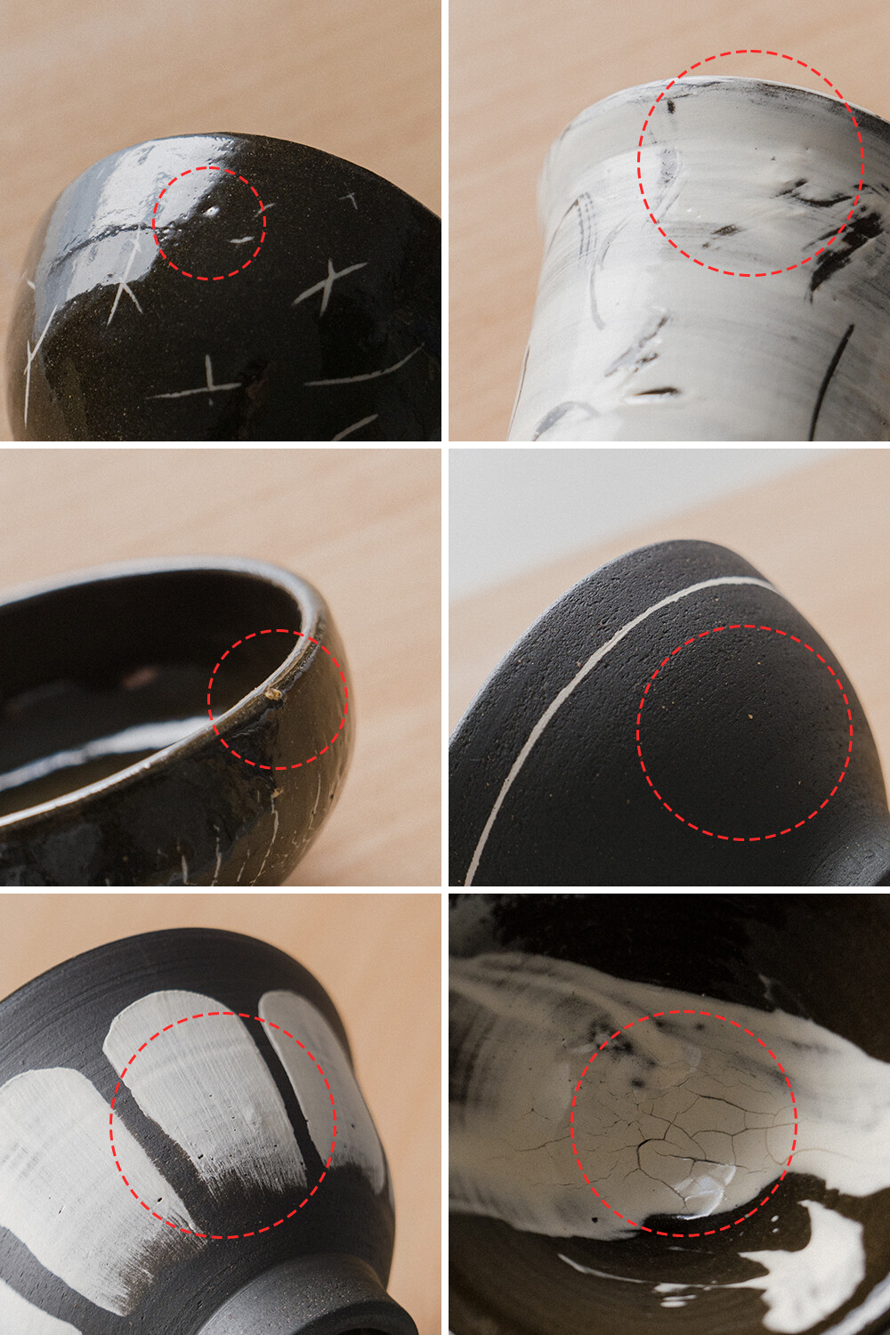 · 철 성분으로 인한 검은 점/갈색 점: 흙과 유약에 포함된 미세한 철 성분이 고온에서 소성되며 작은 검은 점이나 갈색 점으로 나타날 수 있습니다.
