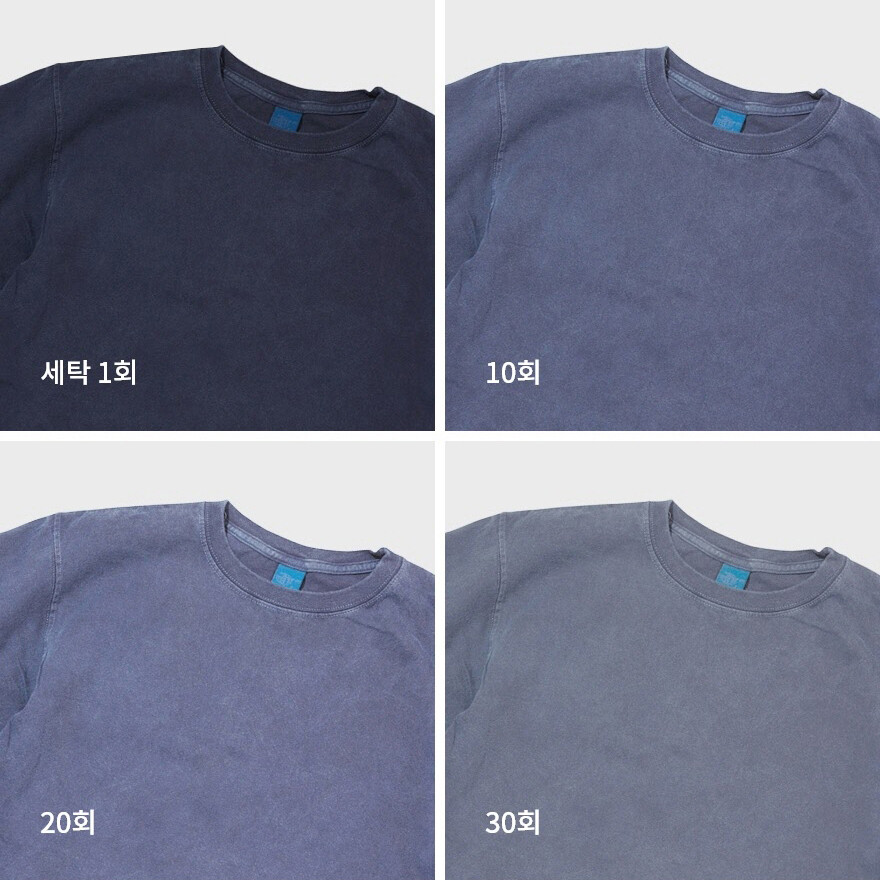 · 세탁에 따른 피그먼트 다잉의 변화. 청바지처럼 세탁 횟수가 늘어날 때마다 색이 빠지며 자연스러운 빈티지한 색감을 만들어 냅니다.